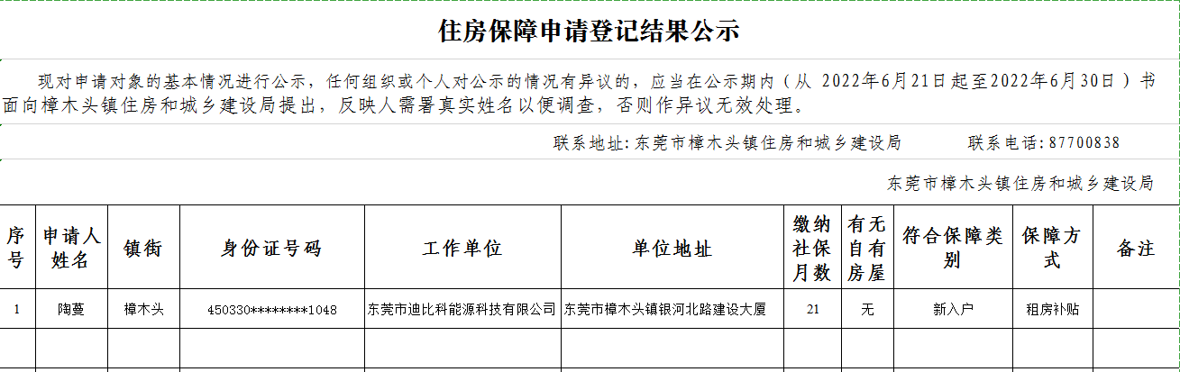 住房保障申请登记结果公示(从 2022年6月21日起至2022年6月30日)