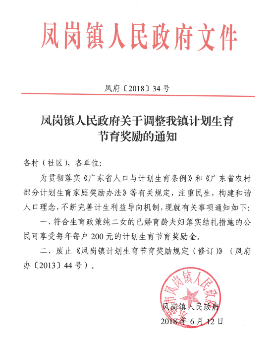 凤岗镇人民政府关于调整我镇计划生育节育奖励的通知