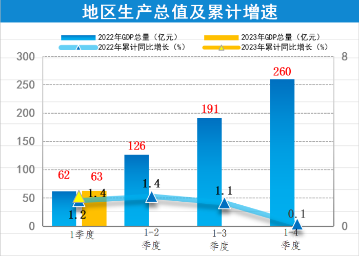 根据东莞市地区生产总值统一核算结果,2023年第一季度,黄江实现地区生产总值为62.8亿元,按可比价计算,同比增长1.4%。其中,第一产业增加值为578万元,按可比价计算,同比增长5.5%;第二产业增加值为41.07亿元,按可比价计算,同比增长0.2%;第三产业增加值为21.66亿元,同比增长4.0%。