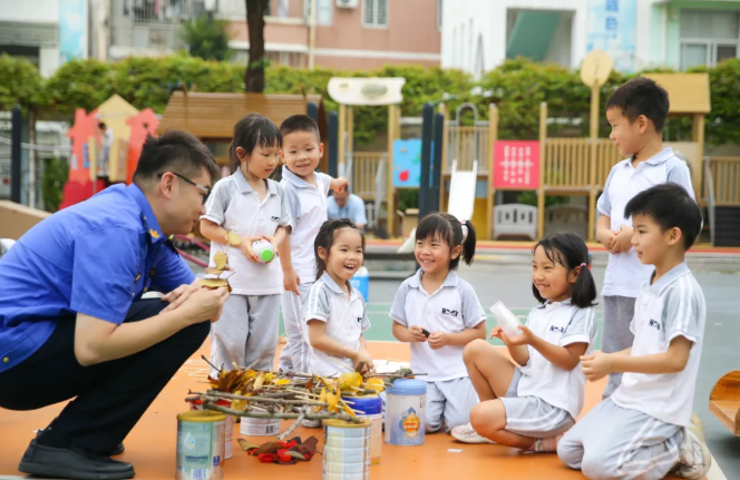 孩子们还利用各种低结构材料,打造“架子鼓”“编钟”等乐器。最吸睛的当属“贝壳风铃”,形状各异的贝壳被彩绳串联,轻轻摇晃便发出清脆声响。这些用低结构材料搭建的“艺术品”不仅装点了园区,更让“垃圾是放错地方的资源”理念深植童心。垃圾分类教育课程,进一步加深孩子们对垃圾分类的了解。