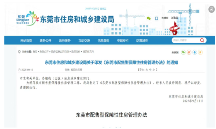 东莞市住房和城乡建设局在今年9月印发《东莞市配售型保障性住房管理办法》(下简称《管理办法》),明确了保障对象、准入条件,轮候排序、退出机制等管理流程和政策指引。