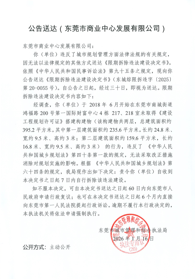 公告送达《限期拆除违法建设决定书》(东莞市商业中心发展有限公司).pdf