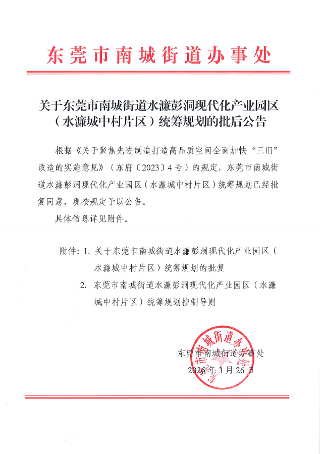 关于东莞市南城街道水濂彭洞现代化产业园区(水濂城中村片区)统筹规划的批后公告.pdf