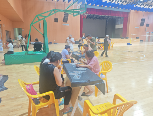 在南城中学安置点,108名建筑工人在体育馆的庇护下,耐心等待台风的结束。