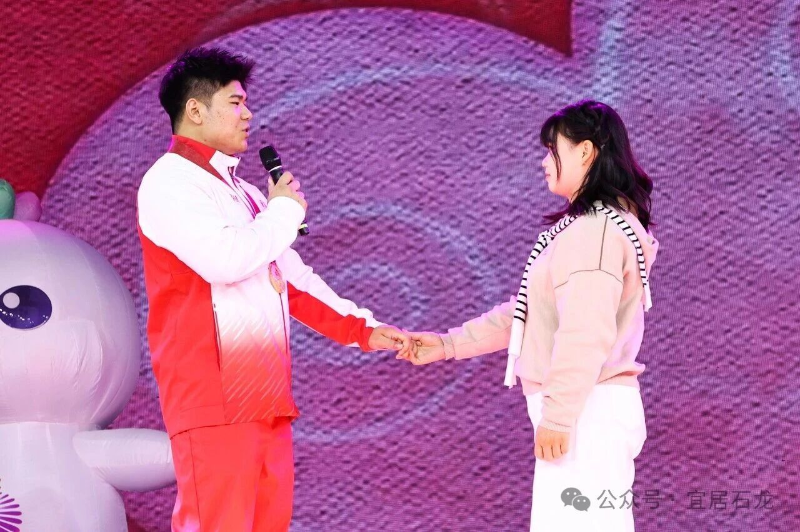 当晚,十五运会吉祥物“喜洋洋”“乐融融”人偶早早在领奖台等候,工作人员手拎寓意美好的石龙花灯,带领刘焕华的伴侣缓缓走向举重赛场中央的领奖台。刚刚夺得男子102公斤级决赛金牌的刘焕华眼神满含深情:“备战全运会的日子里,感谢你一直以来默默的支持与陪伴。”深情告白引发全场阵阵掌声,现场氛围温馨动人。现场,刘焕华的伴侣眼含热泪、点头答应,刘焕华小心翼翼地为她戴上戒指,两人紧紧相拥。随后,刘焕华与伴侣携手向在场所有人员派喜糖——李全和麦芽糖柚皮,把这份浸润着石龙非遗风味的喜悦传递给每一位见证者。