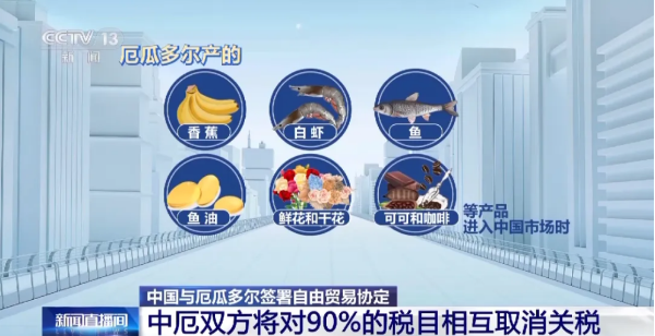 2023年5月11日,中国-厄瓜多尔共和国两国正式签署自由贸易协定,厄瓜多尔成为中国第27个自贸伙伴。协定签署后,两国分别履行各自国内法律审批程序。2023年10月12日,厄瓜多尔共和国宪法法院宣布该协议符合宪法。2024年2月7日,厄瓜多尔共和国国民议会批准了与中国的自贸协定。厄议会批准厄中自贸协定标志着自贸协定厄方程序已全部完成。当地时间2月15日,厄瓜多尔总统诺沃亚签发第166号行政令,批准厄瓜多尔-中国自由贸易协定。根据厄瓜多尔宪法,国际文书须由总统签署或批准。中厄自贸协定的签署对中国与厄瓜多尔进一步深化双边关系、扩大经贸领域合作具有里程碑意义,中厄务实合作将进入发展快车道。根据协定中的货物贸易关税减让安排,中厄双方将分别对90%的税目相互取消关税,其中,约60%的税目在协定生效后立即取消关税。通过自贸协定,厄瓜多尔99.6%的对华出口产品将立即或逐步减免关税。厄瓜多尔是世界上最大香蕉生产国和出口国,其总产量的85%销往世界各地,被称为“香蕉之国”。协定生效后,厄瓜多尔产的香蕉、白虾、鱼、鱼油、鲜花和干花、可可和咖啡等产品进入中国市场时,关税将从目前的5%到20%逐步降至零。同时,厄瓜多尔也将对中国主要出口产品实施零关税。协定生效后,中国产的塑料制品、化学纤维、电气设备、汽车及零部件等大多数产品进入厄瓜多尔市场时,关税将在目前5%到40%的基础上逐步削减取消。根据中国-厄瓜多尔共和国自贸协定,厄瓜多尔的香蕉将在10年内降为零关税,这也意味着中国消费者将越来越便宜地享受到来自厄瓜多尔的优质香蕉。来自厄瓜多尔香蕉营销和出口协会与政府统计机构统计,1月,厄瓜多尔香蕉对非洲和东亚市场的出口同比分别增长了30%和近9%。中国是厄瓜多尔第五大香蕉市场,与2023年1月相比,中国从厄瓜多尔进口香蕉数量激增了56%。这些水果是中国-厄瓜多尔共和国贸易往来的“甜蜜”写照,也是双方贸易往来涉及领域与产品多样化重要体现。