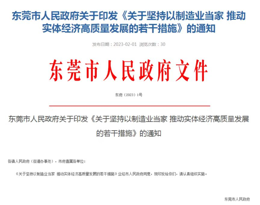 2月1日上午,东莞市政府网站发布2023年市政府“一号文”《关于坚持以制造业当家推动实体经济高质量发展的若干措施》。