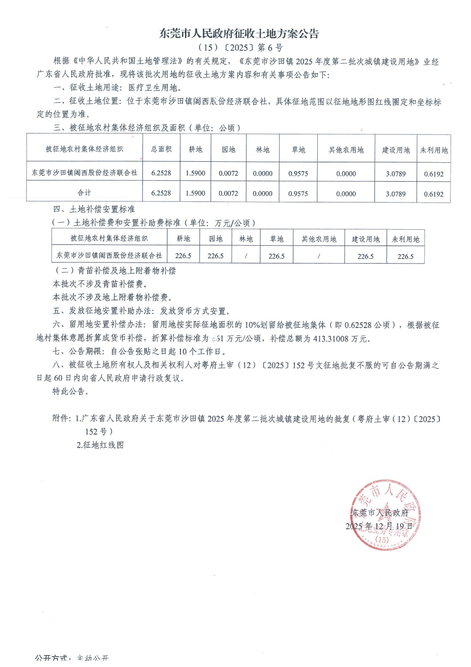 东莞市人民政府征收土地方案公告(15)〔2025〕第6号(东莞市沙田镇2025年度第二批次城镇建设用地)