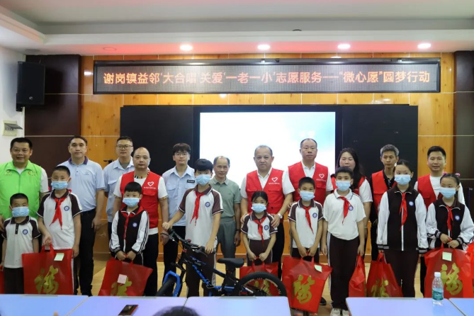 互动环节后,活动迎来最令人期待的高潮--“微心愿”礼物派发。此前,谢岗镇团委联合学校面向学生征集了20份心愿清单,文具、山地自行车、运动球拍等朴素的愿望迅速得到谢岗镇各爱心商家认领。