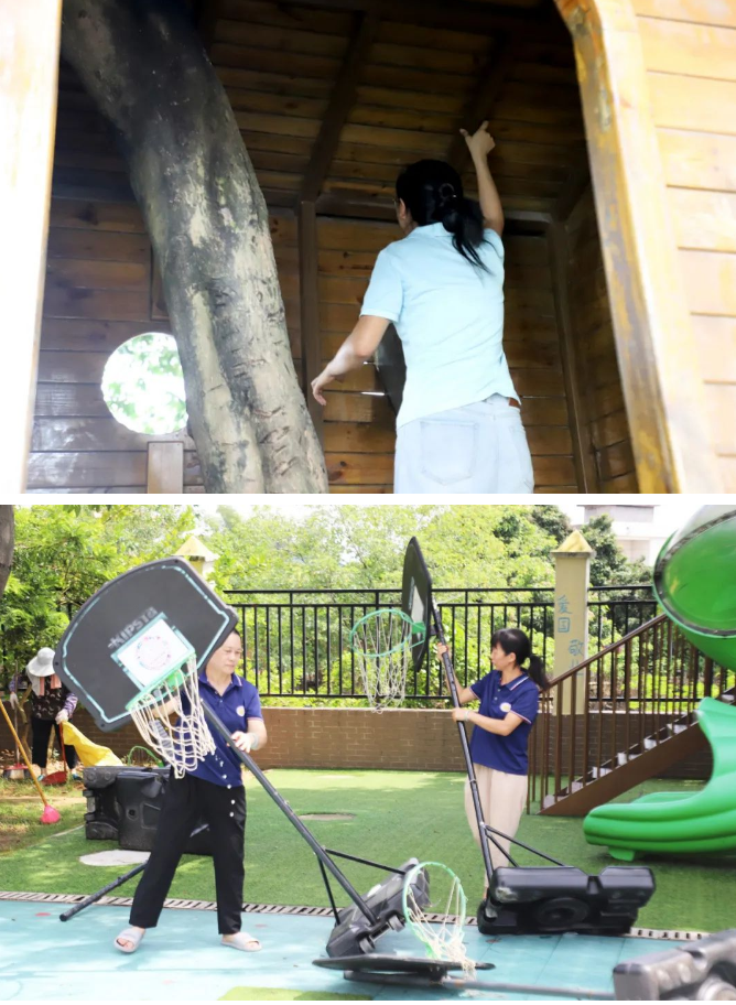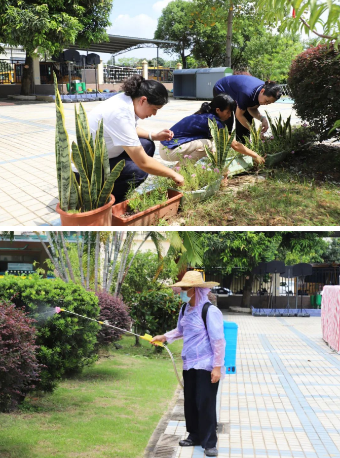 针对幼儿抵抗力较弱的特点,园方对环境整治的要求更为精细。保育老师和后勤人员正一丝不苟地清理雨后积水,整理户外活动器械,对绿化带、厕所等重点区域和卫生死角进行“不留死角”的消毒处理。