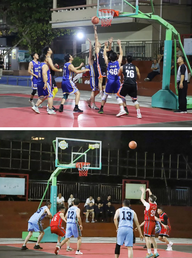 当晚7时整,随着裁判一声哨响,A组和B组的第一轮小组单循环赛同时打响。赛场上,队员们精神抖擞、斗志昂扬,从快速抢断、强攻严守到精准投篮、线外远投,一幕幕扣人心弦的攻防较量不断上演。场外观众欢呼呐喊,加油助威声此起彼伏,将现场氛围一次次推向高潮。
