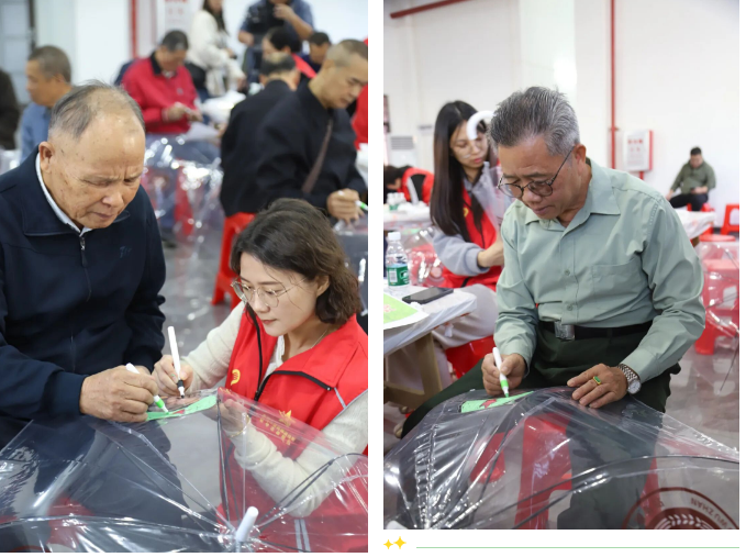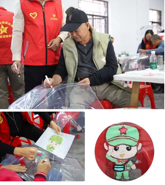 随后的“同心伞”彩绘环节将现场气氛推向高潮。本次彩绘以“军人卡通形象”为主题,退役军人们参照预设为雨伞上色,在工作人员的协助下,大家手持彩笔,专注创作,将“同心同行”的精神内涵融入彩绘之中。一把把普通的雨伞逐渐变得生动鲜明,既体现了军人特有的精神风貌,也传递出团结一心、携手奋进的正能量。
