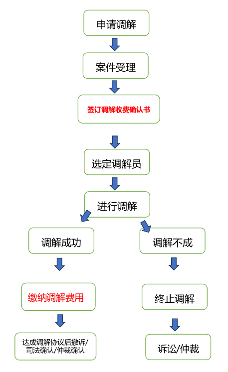 商事调解的优势 (1)程序灵活 与诉讼、仲裁相区别,调解基本不规定具体的程序。调解程序可根据当事人的情况,自由灵活地采用各种方式。包括面对面调解、背对背调解、视频调解、电话调解、微信调解等。 (2)经济高效 中心属非营利性组织,本着服务社会的理念,为当事人快速解决纠纷,节约时间和经济成本。调解期限一般为一个月,双方均同意延长时间的不受限。调解费用比诉讼和仲裁费用少,甚至可以省去聘请律师的费用。 (3)自愿原则 调解以当事人自愿为前提,体现在当事人自愿参与或退出调解,自主选择调解员、调解地点和调解方式,自愿达成调解协议。调解员在主持调解的过程中充分尊重当事人的意愿。 (4)信息保密 调解具有保密性,除非当事人另有约定。调解员、各方当事人、代理人及其他参与调解的人员对于调解事项均负有保密义务。当事人的争议内情和商业秘密得以充分保护。如果调解失败,在调解过程中的谈话内容、承诺或让步均不可以作为诉讼或仲裁的证据使用。 (5)权威团队 调解中心的调解员具有十年以上的调解实践经验,对于调解理论、调解程序和调解技巧都十分熟悉。 中国国际贸促会调解中心还拥有一支遍及全国乃至境外的特邀调解员队伍,其专业领域涉及金融、建筑、知识产权、买卖、租赁、不动产交易等,能够以精湛的专业素质和道德修养帮助当事人排忧解难。 (6)法律效力 经调解达成的调解协议,中心可通过两种方式使调解协议具有强制执行力:第一,当事人可以经调解中心向法院申请司法确认,使调解协议转换成具有强制执行效力的法律文书。第二,当事人可以经调解中心向约定的仲裁委员会申请仲裁,请求按照已达成的调解协议作出裁决书,裁决文书可以在全球140多个《纽约公约》缔约国和地区执行。 (7)提高效益 对比仲裁和诉讼,调解是最温和、不伤和气的化解纠纷的方法,通过调解,可以为企业减少资金成本、时间成本、减少损失、缓和企业之间的矛盾,大大地提高企业的经济效益和效率。 中心受案范围 本调解中心的受案范围包括平等主体的公民、法人及其他组织之间在贸易、投资、金融、证券、知识产权、技术转让、房地产、工程承包、运输、保险、合同法律风险审核以及其它商事等领域的争议。前款所述争议包括: (二)涉及香港、澳门特别行政区及台湾地区的商事争议; (三)外商投资企业之间及外商投资企业与中国其他法人、自然人及经济组织之间的商事争议; (四)国内商事纠纷带有行业特点或专业性较强的争议; (五)其他适合调解中心进行调解的争议。 本中心不受理涉及婚姻、家庭、遗产继承等涉及个人身份关系的民事案件 调解流程 东莞市商事调解中心调解规则 第一章总则 第一条 为了快捷、有效、低成本地运用调解的方式解决商事争议,特制定本调解规则。 第二条 国内外平等主体的自然人、法人和其他组织之间发生的商事争议及其他特殊主体之间约定的特别争议,均可提交东莞市商事调解中心(以下简称“调解中心”)调解。 第三条 当事人同意将争议提交调解中心调解的,视为同意按照本调解规则进行调解。 当事人另有约定,且经调解中心同意的,从其约定。 第四条 调解应遵循当事人自愿的原则,根据相关法律法规,参照国际惯例,公正公平地促进当事人互谅互让,达成和解。 第五条 各方当事人应当诚信合作,自觉遵守调解规则及有关法律规定,积极参与调解程序,自觉履行达成调解协议。 第六条 经当事人同意,调解中心可与其他争议解决机构进行联合调解,也可以接受其他争议解决机构的邀请或委托对争议进行联合或单独调解。 第七条 调解中心根据需要,可以与国内外其他组织成立联合调解机构。 调解中心及调解中心与其他组织成立的联合调解机构统一适用本调解规则,有特别规定的除外。 第二章调解程序 第一节调解的申请与受理 第八条 调解中心根据当事人之间订立的调解条款,以及一方当事人的申请或各方当事人的共同申请,受理调解案件。 当事人之间没有订立调解条款的,调解中心也可受理当事人的调解申请,由调解中心征求其他当事人同意后,开始调解程序。 调解条款是指当事人之间达成的以调解方式解决争议的约定。 第九条 当事人向调解中心申请调解,需要提交: 1、调解申请书,内容包括: (1)各方当事人的名称、地址、联系人、联系电话、证件号码等。 (2)调解请求。写清楚标的、计算起止时间和计算标准等。 (3)事实与理由。写清楚事情的经过,为何发生争议等。 (4)当事人为自然人的签名盖指印,当事人为法人或组织的需要盖章和法定代表人签名,写上日期。 2、身份证明材料。 申请人为个人的提交身份证复印件;申请人为法人或其他组织的需提交营业执照复印件、法定代表人身份证明书、法定代表人身份证复印件。 申请人还需要提交被申请人的身份证明,被申请人为个人的提交身份信息资料,被申请人为法人或其他组织的提交工商登记资料。 3、如果当事人有代理人的,提交委托资料。 4、证据材料复印件。 第十条 当事人申请调解时,应当告知其调解中心的调解费用收费办法和收费标准,申请方同意后需签订《调解费用确认书》,并缴纳案件管理费。 第十一条 当事人未缴纳案件管理费的,调解中心可中止或者终止调解程序。 第十二条 调解中心受理案件后,应及