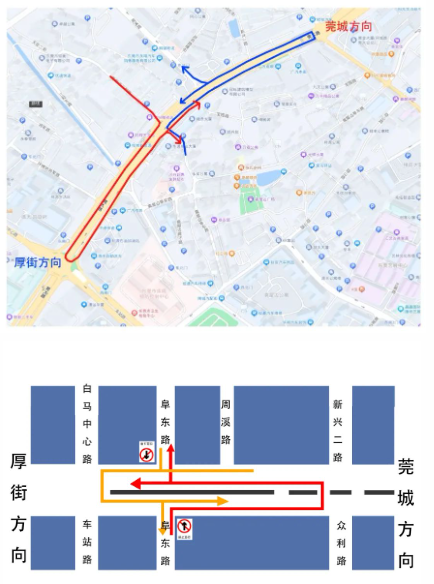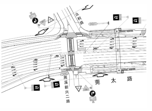 为确保安全,1月8日开始围蔽进行路口施工改造。工程实施期间及之后,周溪路口和阜东路口进出莞太路的机动车辆进行右进右出的交通管制,路口改造方案和绕行方案详见以下图所示。请过往车辆听从现场交警及协管人员的指挥。