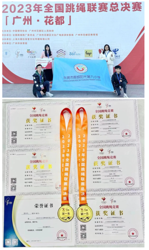 南城阳光第九小学跳绳队 2023年,南城阳光第九小学校跳绳队成绩斐然,先后获广东省中小学跳绳锦标赛小学组团体总分二等奖,东莞市中小学生跳绳比赛获团体总分第二名,广东省中小学生跳绳公开赛(佛山站)小学组团体总分第五名,广东省中小学生跳绳公开赛(广州站)小学组团体总分第三名,广东省中小学生跳绳锦标赛小学组团体总分第五名。