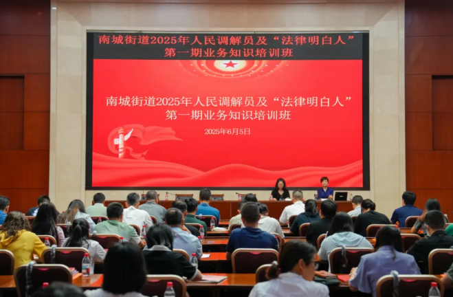 6月5日上午,南城司法分局在宏图科技中心开展2025年人民调解员及“法律明白人”业务知识培训,为各社区居委会调解骨干和“法律明白人”,各驻所调解室、个人调解室专职人民调解员,行业性、专业性、商会及其他调委会人民调解员开展专题讲座,进一步提升队伍专业能力,充分发挥人民调解员和“法律明白人”在矛盾纠纷化解中的重要作用。