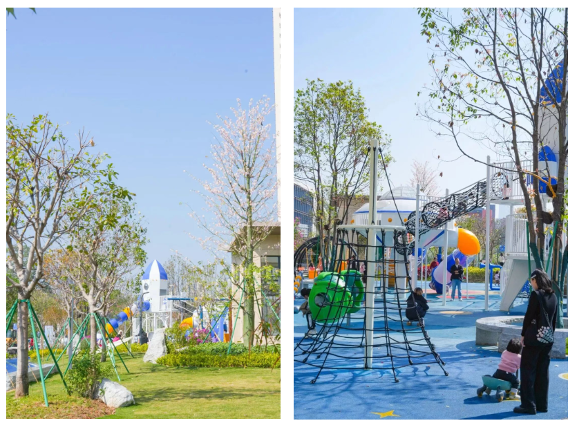 提供切磋球技的舞台。最让人惊喜的是体能觉醒场,集聚多款智能化的健身器材,满足各种运动需求。专业设施配合绿化造景,实用又好看,市民尽情挥洒汗水、释放精力,让人不禁赞叹:这个“户外健身房”绝了,活力童趣区:遛娃天花板。