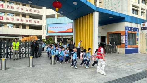 会议结束后,与会人员一同现场观摩了模范学校的接送岗护学情况。由中心小学展示了该校接送岗秩序井然的管理模式。值班教师、保安人员与家长志愿者相互配合,引导学生有序离开校园,确保学生的交通安全。公安分局民警、铁骑等也在现场维持交通秩序,为学生们的安全保驾护航。