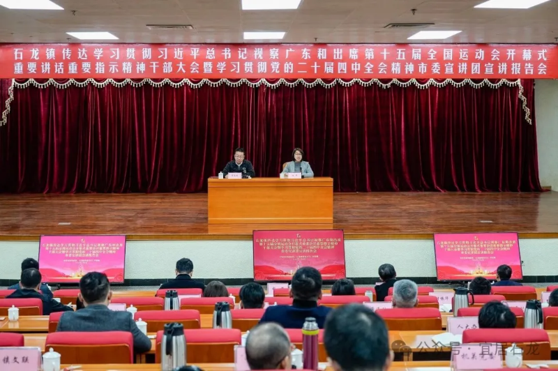 1月6日下午,石龙镇传达学习贯彻习近平总书记视察广东和出席第十五届全国运动会开幕式重要讲话重要指示精神干部大会暨学习贯彻党的二十届四中全会精神市委宣讲团宣讲报告会在镇政府一楼大会堂举行。市委宣讲团成员、石龙镇党委书记李亚鹏作宣讲主题报告。镇党委副书记、镇长张炜主持会议。镇全体领导班子成员,各党政机关行政事业单位负责人,各村(社区)书记,离退休干部代表,各公办中小学校、幼儿园负责人以及镇百姓宣讲团成员代表等参加报告会。
