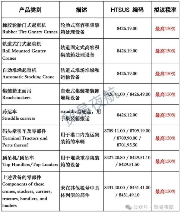 美国贸易代表办公室(USTR)宣布对特定中国制造的港口设备征收高额关税,作为Section 301行动的一部分,具体如下: