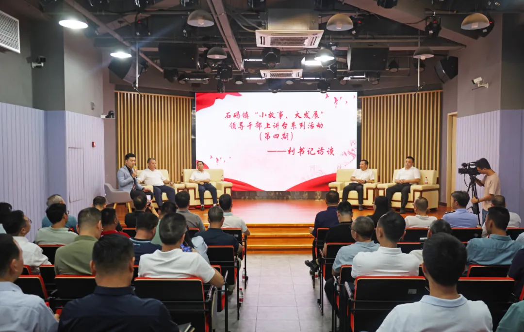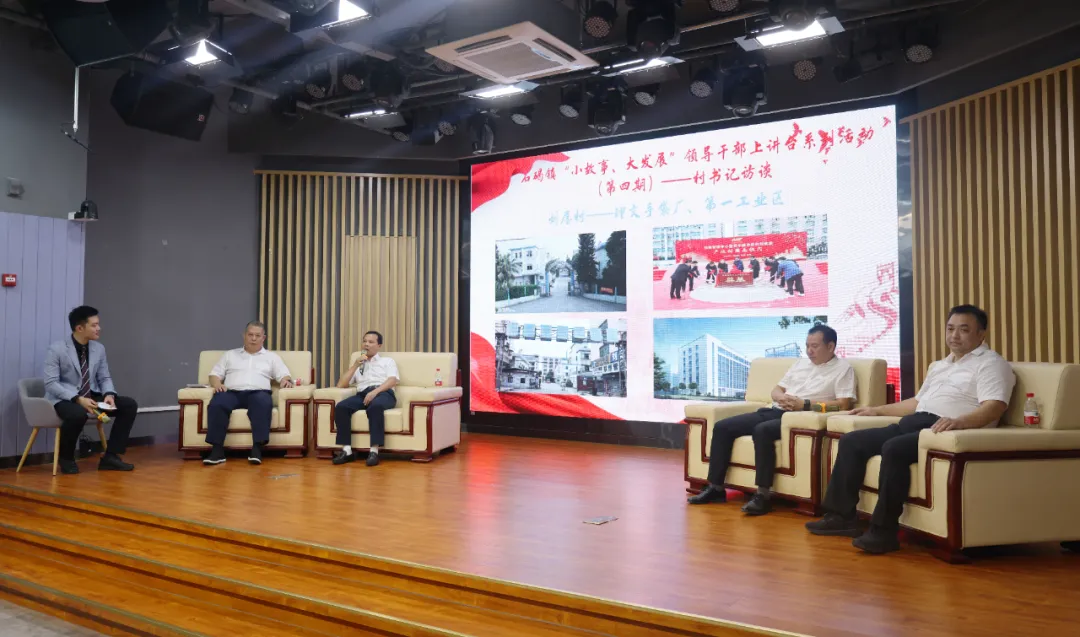活动以村书记访谈的形式开展,邀请石碣村党委书记袁国祥、刘屋村党委书记刘健柏、四甲村党委书记何贺权、西南村党委书记何健勋一同上台,为大家分享各村在经济发展过程中涌现出来的一个个小故事。