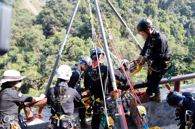 演练现场,各救援参演人员严守操作规程,克服高空救援带来的心理恐慌等不利因素,迅速展开救援行动。无人机搜索救援、T型救援、主动上升和被动下放救援、绳索斜下救援、高空横渡救援等实战科目逐一上演,全面检验了队伍的救援能力和专业素养。