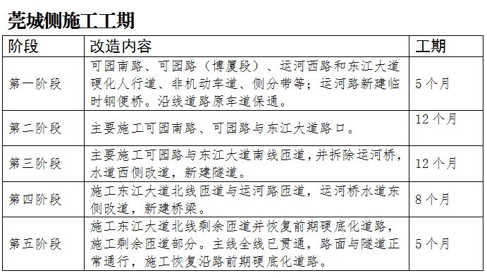 据了解,莞太路升级改造二期(可园隧道)工程起点位于万道路北侧,沿莞穗路下穿东莞水道后进入莞城街道,下穿东莞运河后,于莞太路北侧接地。全长约2284m,城市主干路,主线双向6车道、设计速度 60km/h;辅道双向4车道、设计速度 40km/h。项目计划于2025年7月底动工建设,总工期48个月。莞城街道工程将分为五个阶段逐步实施。