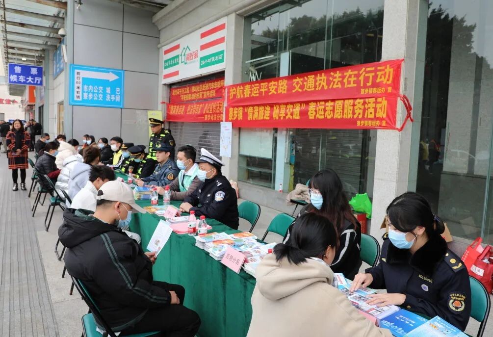 春运期间,寮步镇组织志愿者在购票窗口、行李安检处、进站乘车环节做好志愿服务保障工作,给旅客提供指引等出行帮助。还通过摆设宣传摊位、向出行群众派发宣传单张及普法资料、现场答疑等多种方式,引导群众增强春运出行交通安全意识。