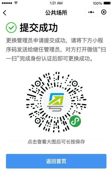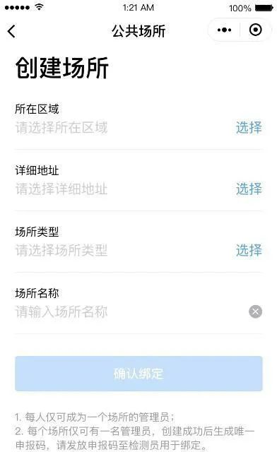 1)创建公共场所:公共场所管理员扫描小程序码,进入公共场所管理员端(请注意不要与组织机构管理员端混淆),填写所在区域、详细地址、场所类型、场所名称,确认后即可创建成功(一个场所只能绑定一个管理员,一个管理员也只能创建一个场所,管理员可同时绑定成为检测员)。