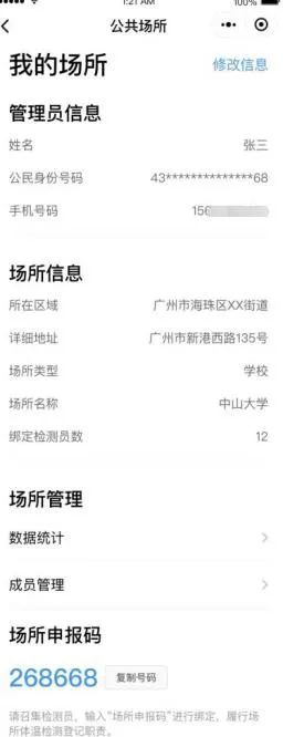 2)生成场所申报码:管理员完成公共场所创建后,进入“我的场所”页面,可通过“复制号码”分享“场所申报码”给该场所的各公共场所检测员。