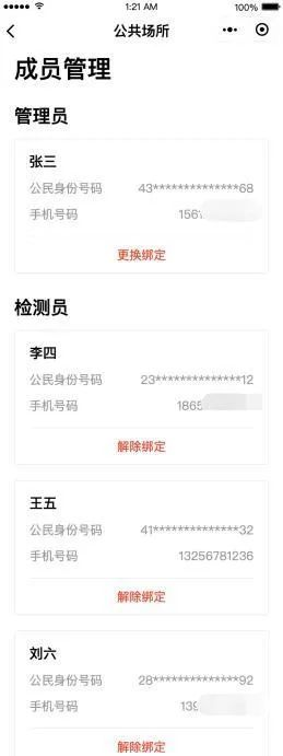 4)成员管理:公共场所管理员进入“成员管理”页面,可进行更换管理员、解绑检测员操作。