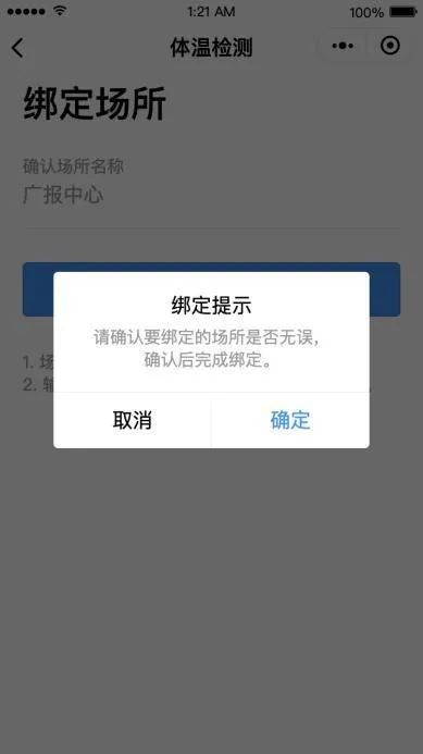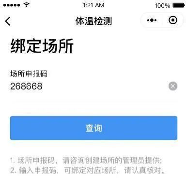1)绑定公共场所:检测员扫描小程序码,通过输入公共场所管理员提供的“场所申报码”绑定场所(一个场所可以绑定多个检测员,一个检测员可以绑定多个场所)。