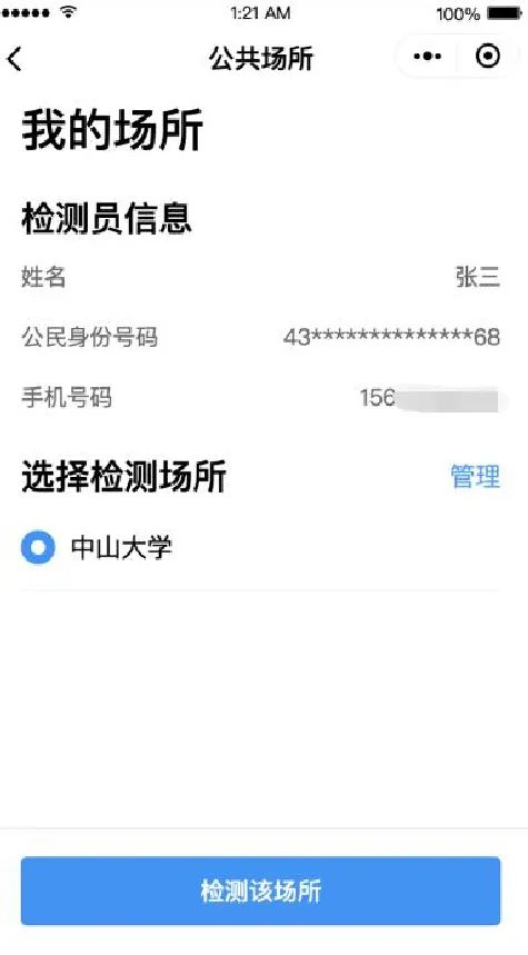 2)管理我的场所:进入“我的场所”页面,可选择场所进入检测页面。点击“管理”进入场所管理页,支持新增绑定公共场所、解除绑定公共场所。