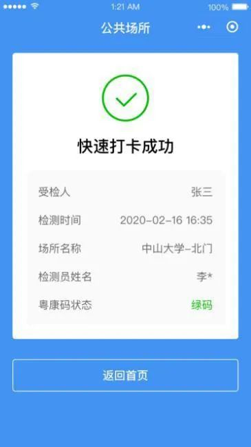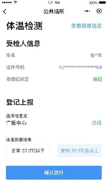 “体温正常快速打卡”功能:在群众被检测体温正常时,检测员无需扫码登记,可引导其用微信扫描快速打卡小程序码,即可快速打卡,默认体温正常。对未持智能手机或操作智能手机有困难的老人、小孩、残疾人等群体,可以让其同行亲朋好友代为出示或扫描其携带的实体“粤康码”。“粤康码”上方提供了添加和管理家庭成员功能,以及切换家庭成员“粤康码”的入口,检测员可进行现场引导。