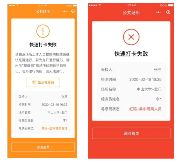注意:“粤康码”红、黄码人员使用“体温正常快速打卡”功能时,将显示其粤康码并提示“快速打卡失败”。