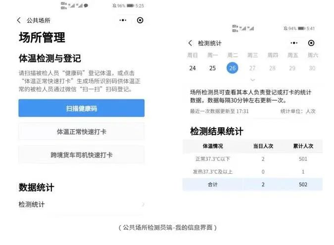 各公共场所(交通场站、餐饮住宿、商场景点、娱乐场所、居民小区、工厂企业、机关企事业单位、政务服务大厅、医疗机构、建筑工地等)需确定场所管理员和检测员。场所经营负责人自身可成为场所管理员,也可指定工作人员作为管理员。并指定若干工作人员作为检测员,负责出入口场所码扫码查验相关工作。