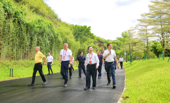 郑建民一行先后实地调研了水濂社区九里潭、水濂山碧玉湖公园及水濂山森林公园,实地了解人居环境整治、水濂山石场生态修复、森林公园生态建设等情况,听取南城街道推进绿美东莞生态建设情况介绍。