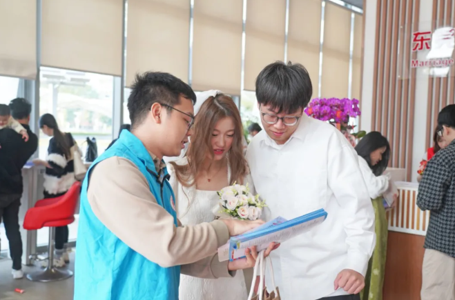 | 活动现场 当日上午,南城街道新时代文明实践中心联合东莞市婚姻登记管理中心,在东莞市民政局婚姻登记处开展“文明婚俗,有条有礼”主题宣传活动,引导新人树立正确的爱情观、择偶观和婚恋观,大力推进移风易俗,树立文明新风,营造向善向上的社会风尚。 工作人员向婚姻登记新人以及市民发放《东莞市文明行为促进条例》《文明婚俗新风倡议书》等宣传物料,倡导简约适度、现代文明的婚俗新风、抵制高额彩礼、铺张浪费等陈规陋习,营造健康节俭文明的婚嫁氛围。 现场设置“文明新风”趣味问答游戏,市民在作答的过程中,加深对文明婚俗理念,和相关法律法规的了解。 前来登记领证的李女士表示,很赞同《文明婚俗新风倡议书》的宣传理念,“婚事新办”是一种新风向,免去繁琐的程序,避免铺张浪费,也减轻了双方家庭的负担,让婚礼回归本质。